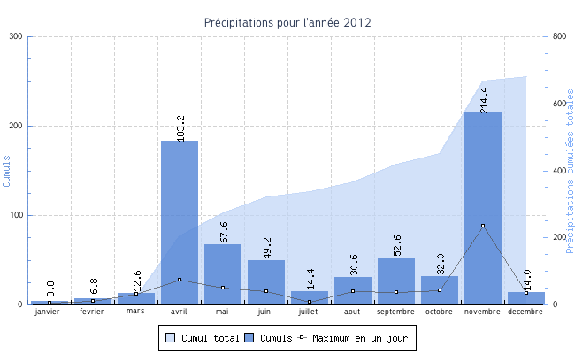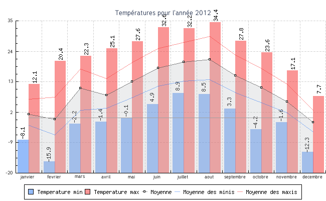 | decembre | -12.3 °C | -5.0 °C | 7.7 °C | 2.8 °C | -1.6 °C | 2.3 km/h | 37.0 km/h | ESE |