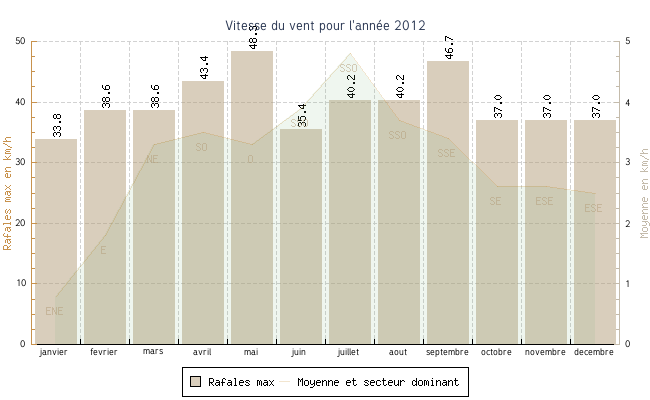 | juin | 4.9 °C | 11.4 °C | 32.6 °C | 25.0 °C | 18.0 °C | 3.9 km/h | 35.4 km/h | SSO |